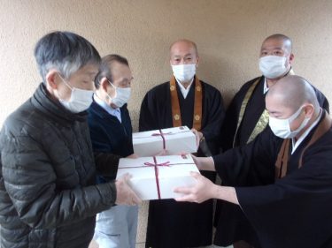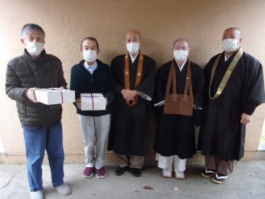 入所者を代表し、互助会会長と副会長から品物を受け取っていただきました。