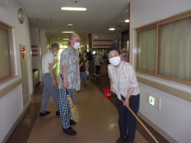 ⑤全棟廊下みがき 皆さんと一緒に職員もお掃除をします
