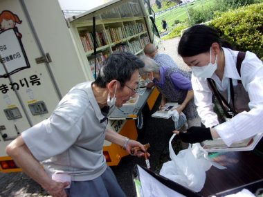 ④ 自動車文庫の見守り 貸し出しの見守りや返却の声掛け、転倒がないように見守ります